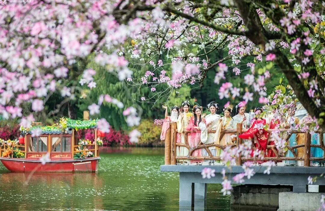 “光有花还不行,得让人愿意留下来。如今景区主打‘赏花+’模式,将赏花与汉服体验、游船观光、非遗展示等融合,打造沉浸式场景。这种创新模式,有效延长了游客停留时间。”