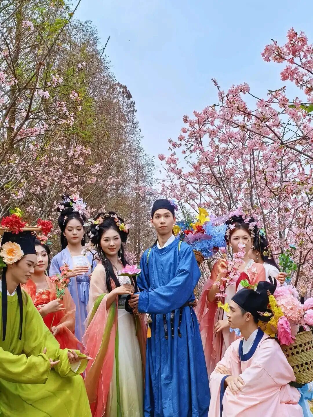 衣着华丽的“花仙”与背着花篮的“簪花郎”