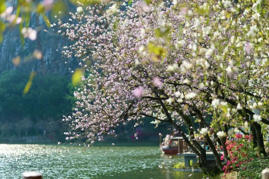 七星岩景区的樱花、宫粉紫荆开得正盛,