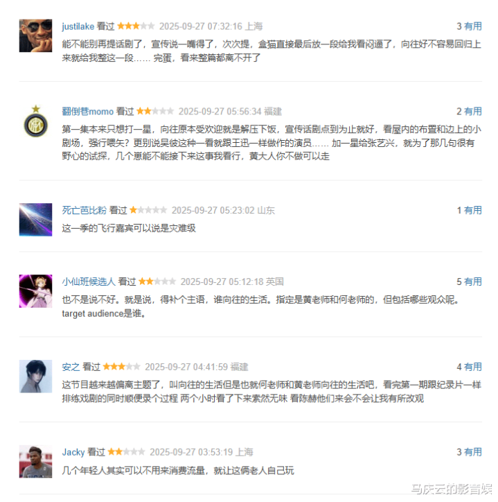 也有差评内容,提到了这一期当中明星们连劳作都没有了的问题。开局第一天,就是四个人一起发呆,硬凑几句话出来。开局第二天,没有人做饭,吃饭还是外边买回来的,这一次,是连遮掩都不遮掩了。以往节目当中,还得用劳动换食物,这一季,连这个遮羞布都不要了。